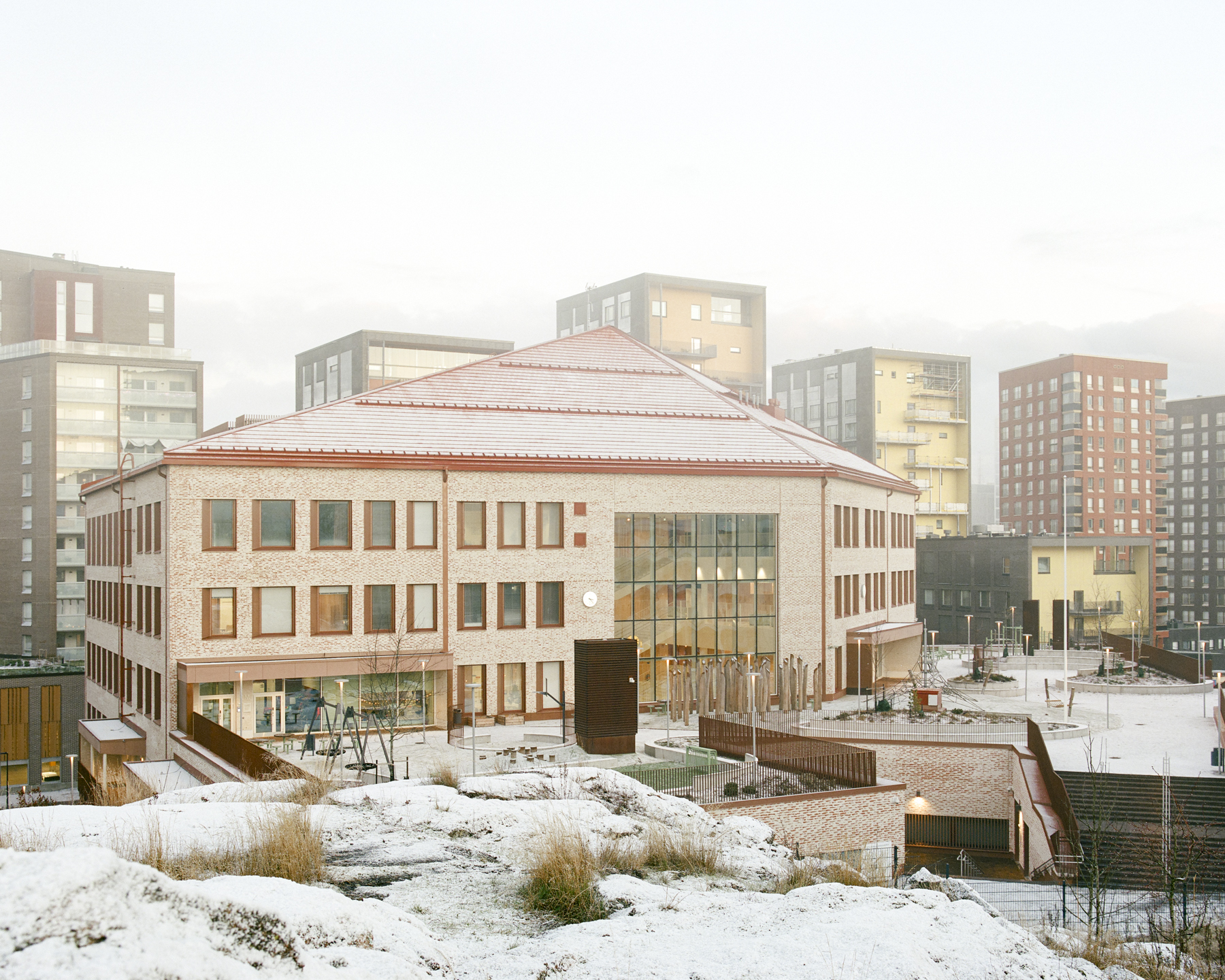 Arkkitehtoninen konsepti perustuu kaavassa olleen umpikorttelin muuttamisena siten että tontille iso rakennusmassa sopeutetaan mittakaavallisesti ja kaupunkikuvallisesti istumaan ympäristöön. Rakennuksen kaksi ensimmäistä kerrosta muodostavat kaupunkitilaan avautuvan rinteeseen uppoavan jalustan. Tämän päälle sijoittuu koulun piha ja sen keskellä rakennusmassa, johon sijoittuvat suurin osa luokkatiloista. Pihalta rakennus hahmottuu kolmikerroksisena ja helposti lähestyttävänä myös pienille oppilaille. Ratkaisun myötä piha saa auringonvaloa koko päivän ajan ja sieltä avautuu pitkät näkymät ympäröiviin puistoihin. Piha-alue kasveineen, leikkialueineen ja sinne johtavine istuskeluportaineen liittyy osaksi vaihtelevaa ja polveilevaa yhteistä julkista maisematilaa.