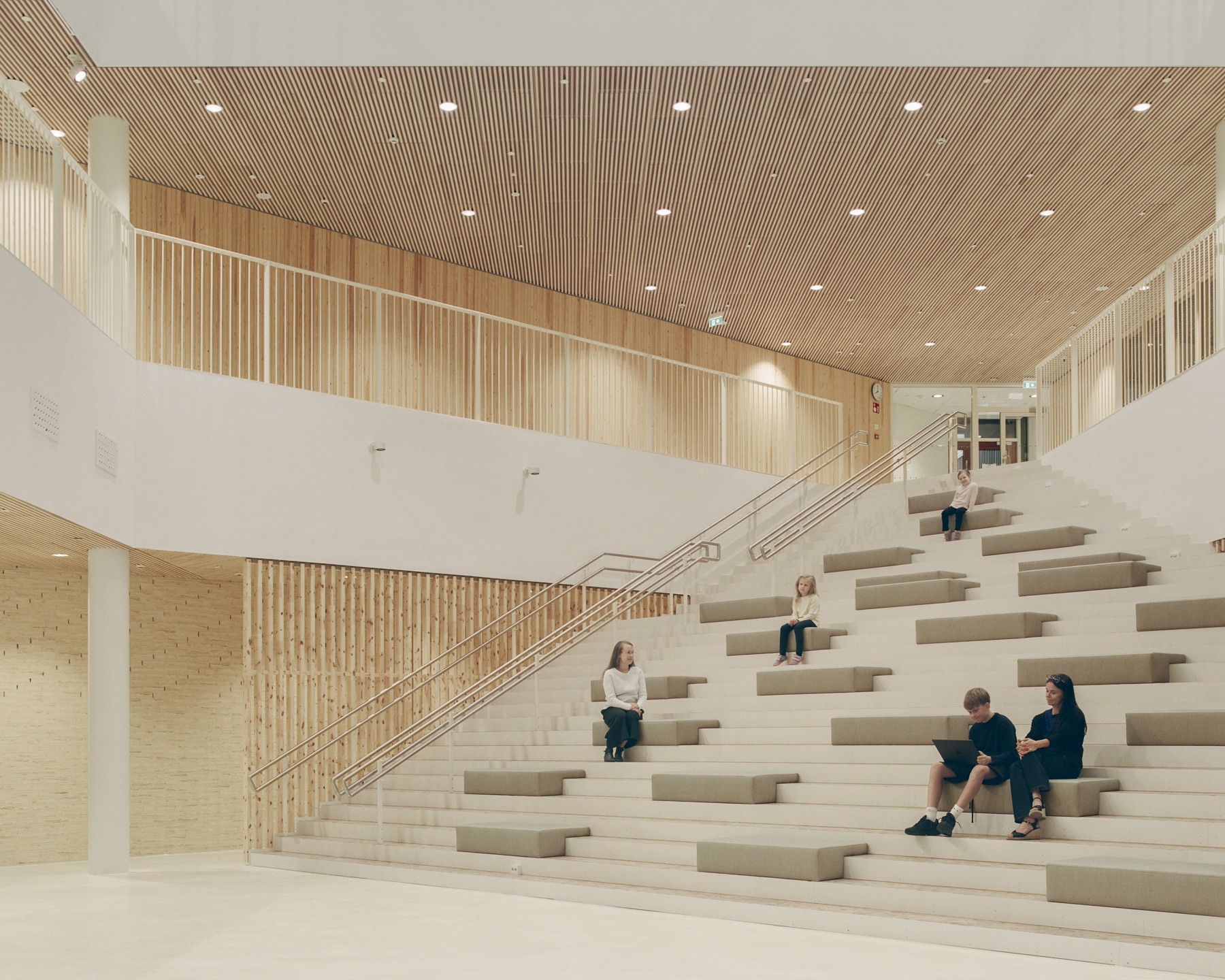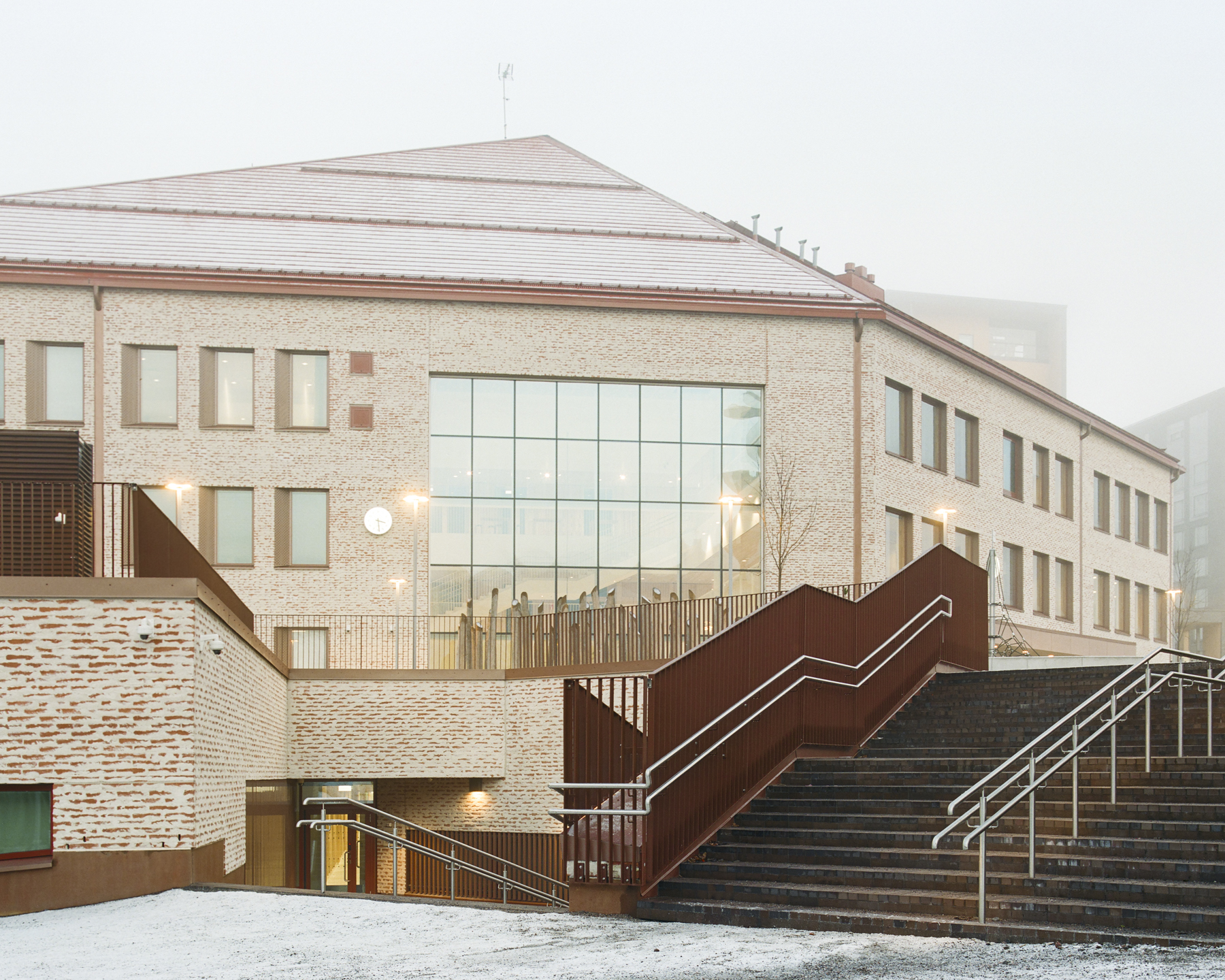 Rakennuksen tilat ryhmittyvät selkeästi hahmotettaviksi kokonaisuuksiksi yhteisöllisiä toimintoja sisältävään kaksikerroksiseen jalustaosaan ja astetta yksityisempään korkeaan osaan, jonne sijoittuvat yleisen oppimisen korttelit.