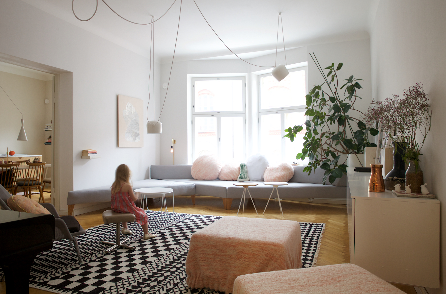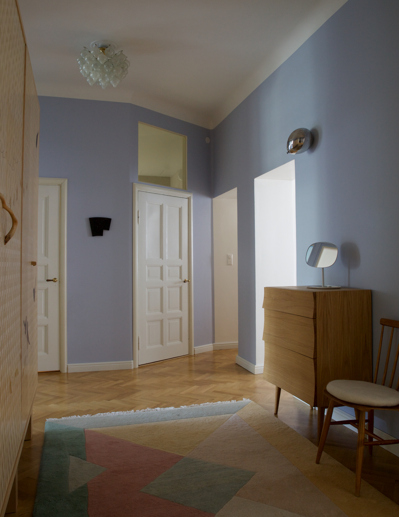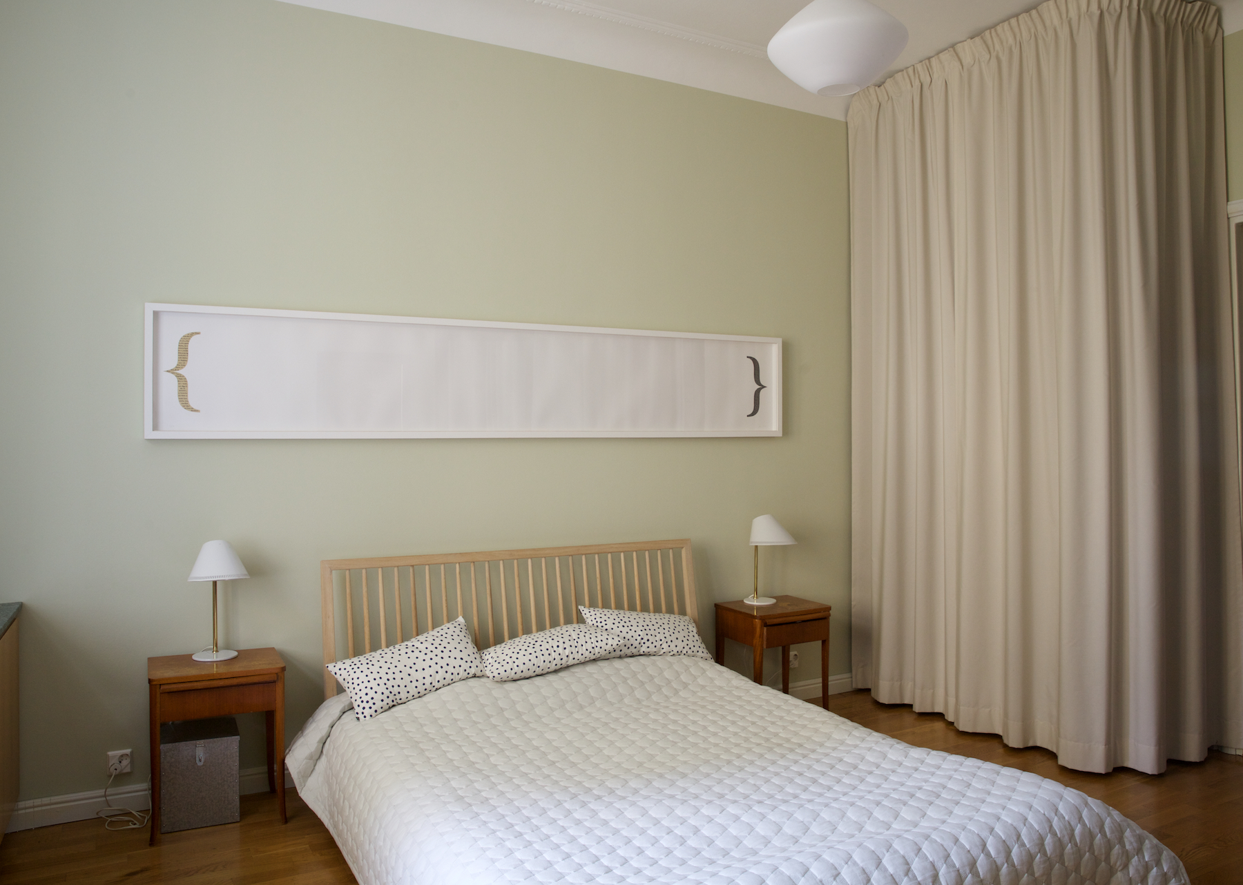 Asuntoon suunniteltiin muunneltava sohva ikkunasyvennyksen muodon mukaan, vierassängyiksi muunnettavat rahit, keittiöön massiivipuinen senkki ja ruokapöytä sekä kaikki muut kiintokalusteet.