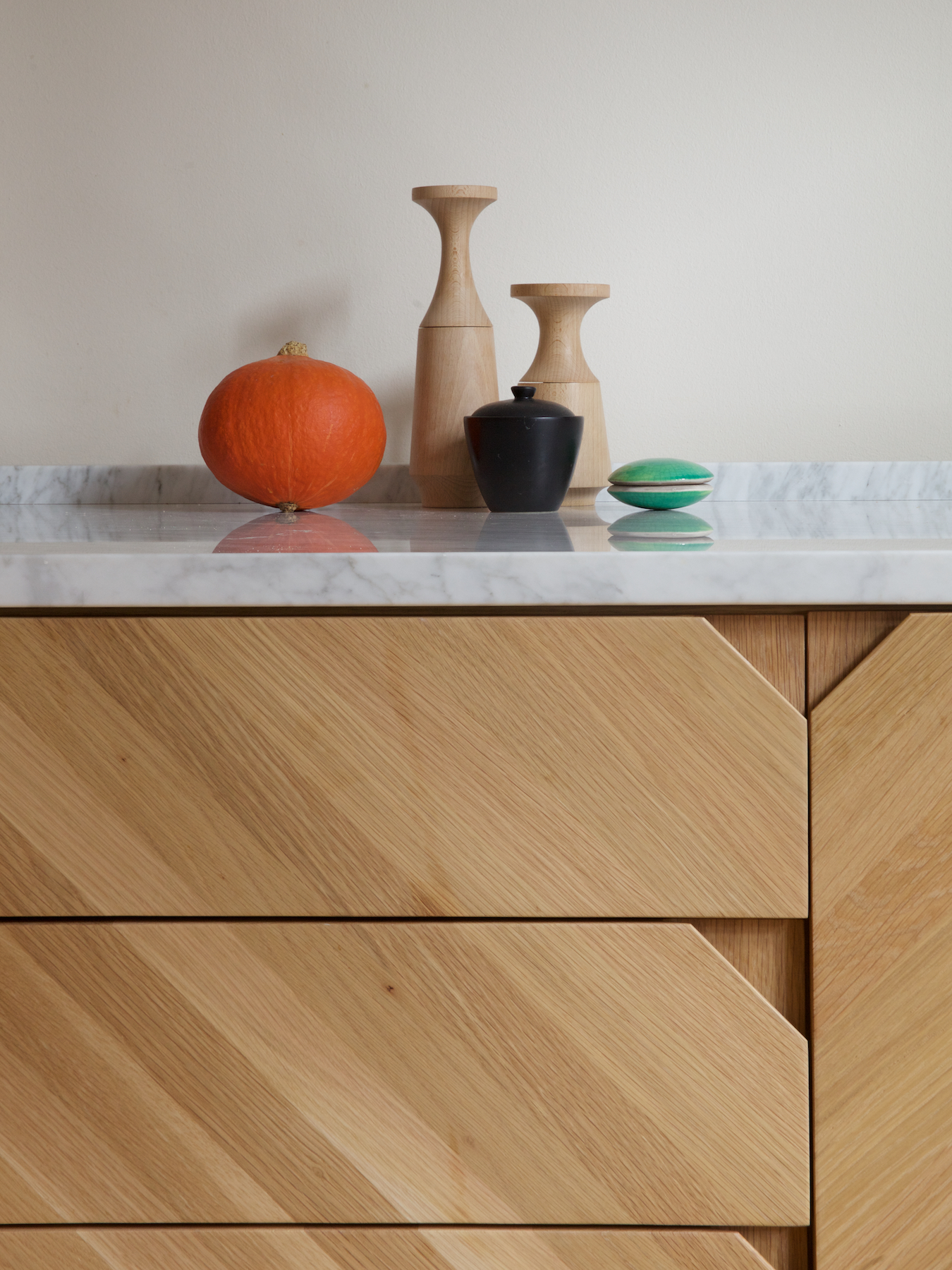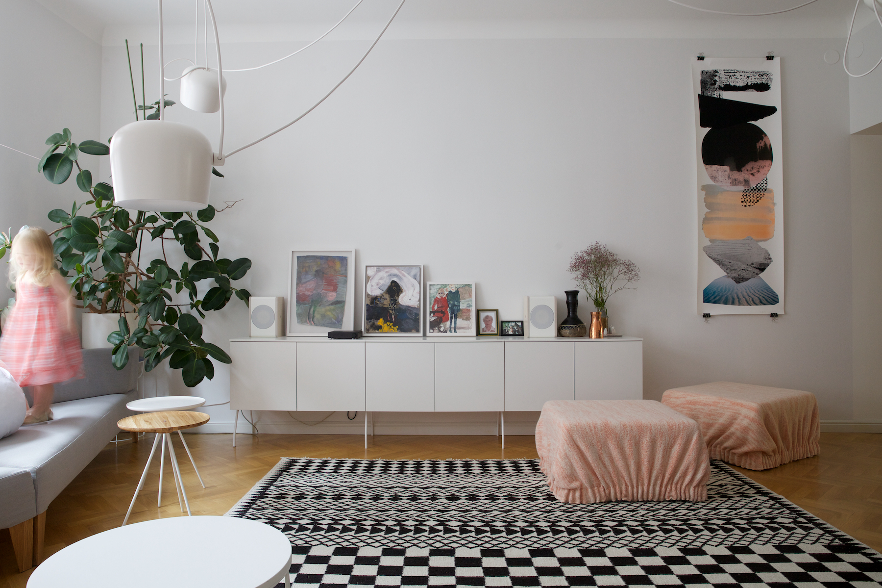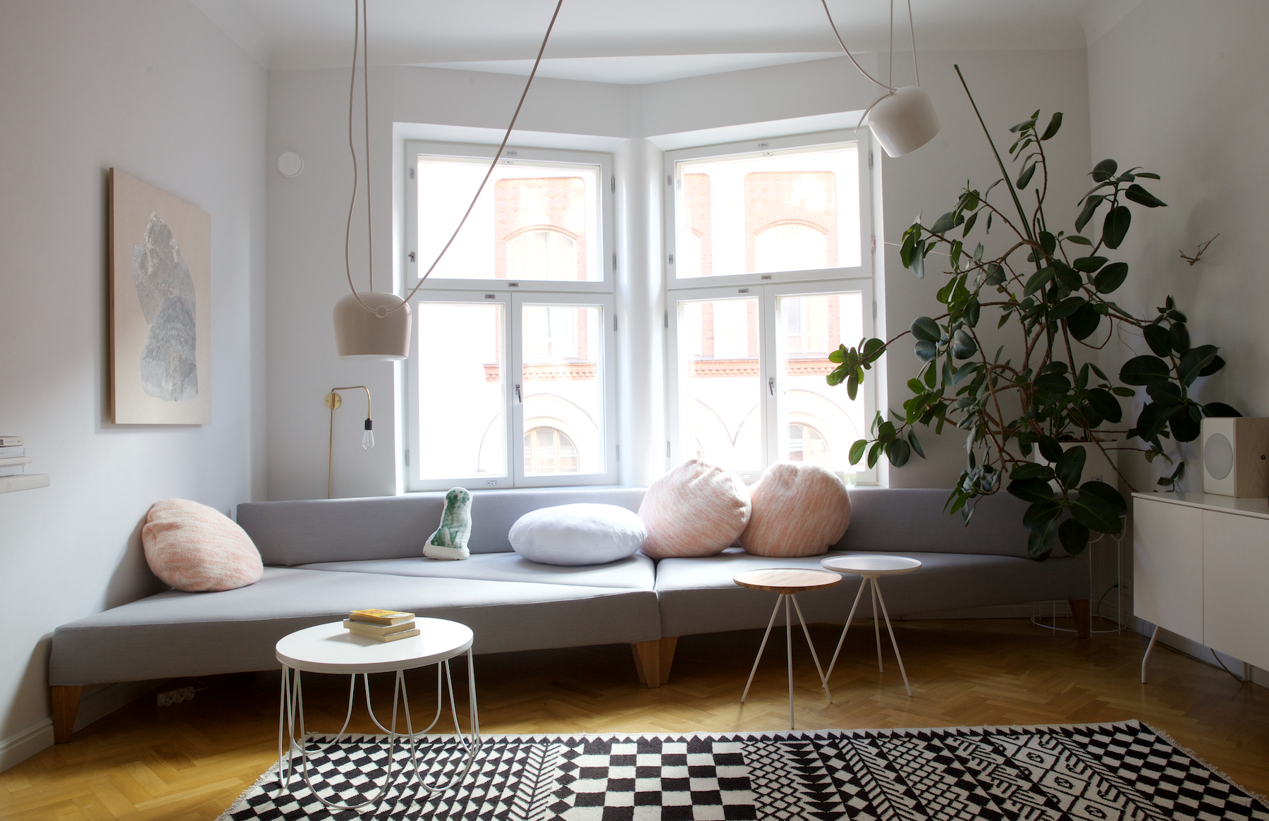 Asuntoon suunniteltiin muunneltava sohva ikkunasyvennyksen muodon mukaan, vierassängyiksi muunnettavat rahit, keittiöön massiivipuinen senkki ja ruokapöytä sekä kaikki muut kiintokalusteet.