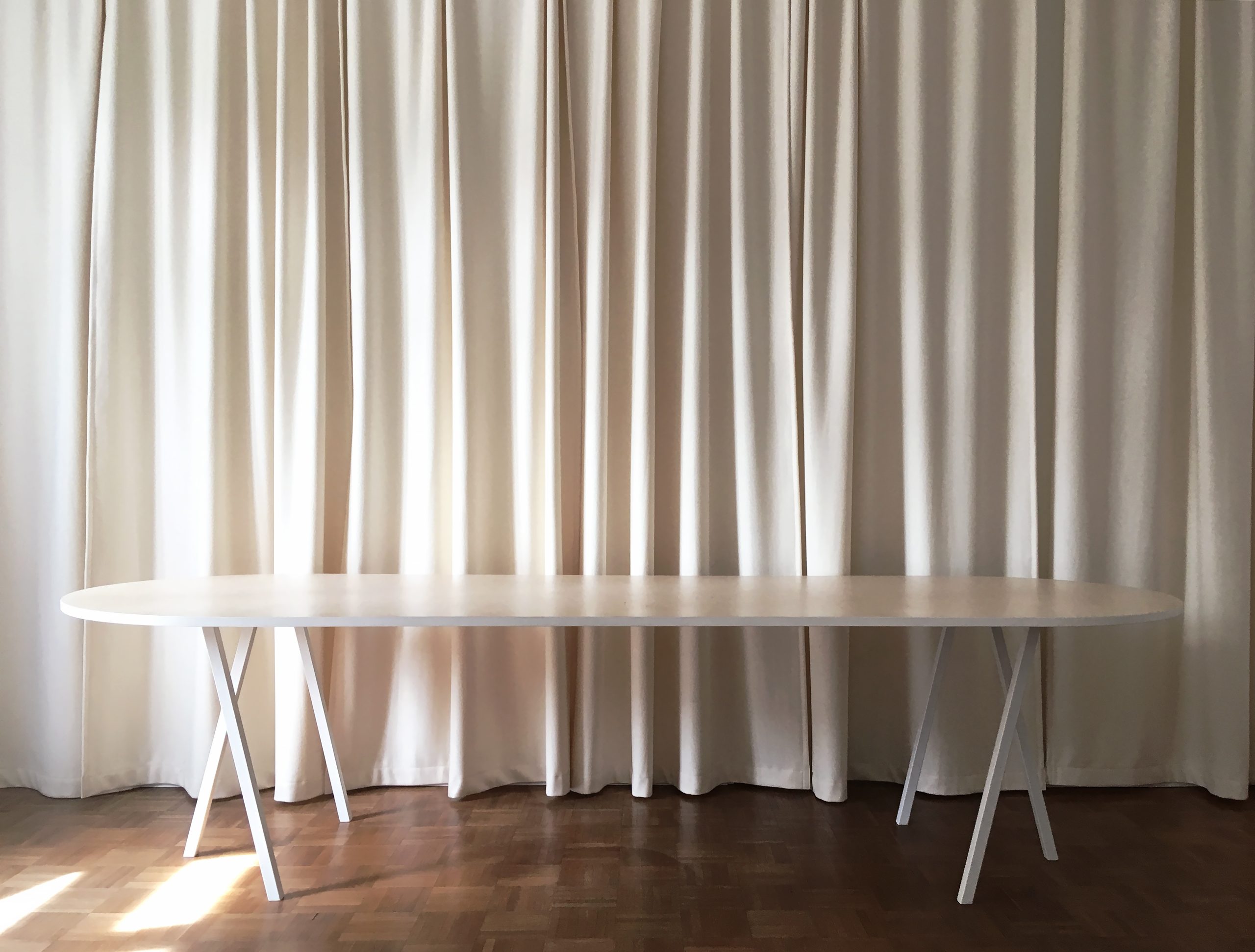 Ovaali ruokapöytälevy pukkijaloilla. Pöydän pyöristetyt päädyt luovat lempeän ja keveän ilmeen, ja muotoilun ansiosta pöytä on lapsiystävällinen.