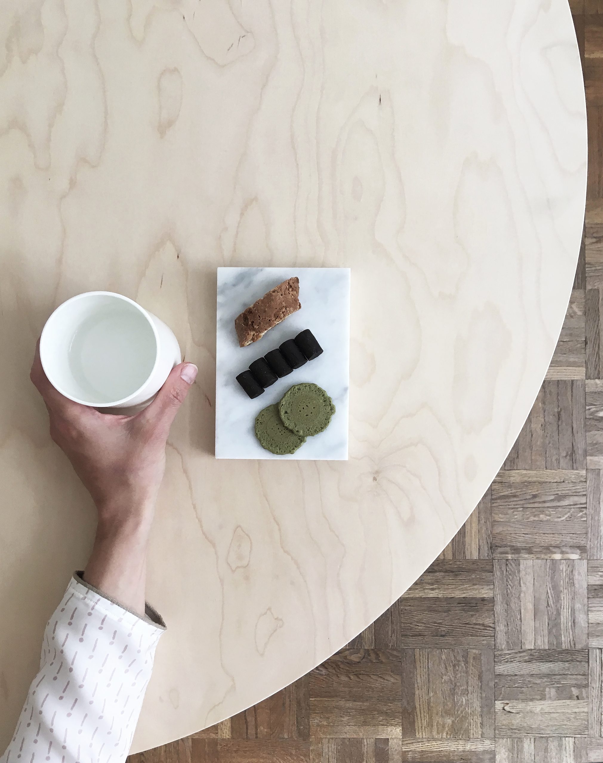 Pöytälevyn materiaali on koivuvaneri, alapinta ja reunat on maalattu valkoiseksi tai mustaksi. Yläpinta on valkoöljytty.