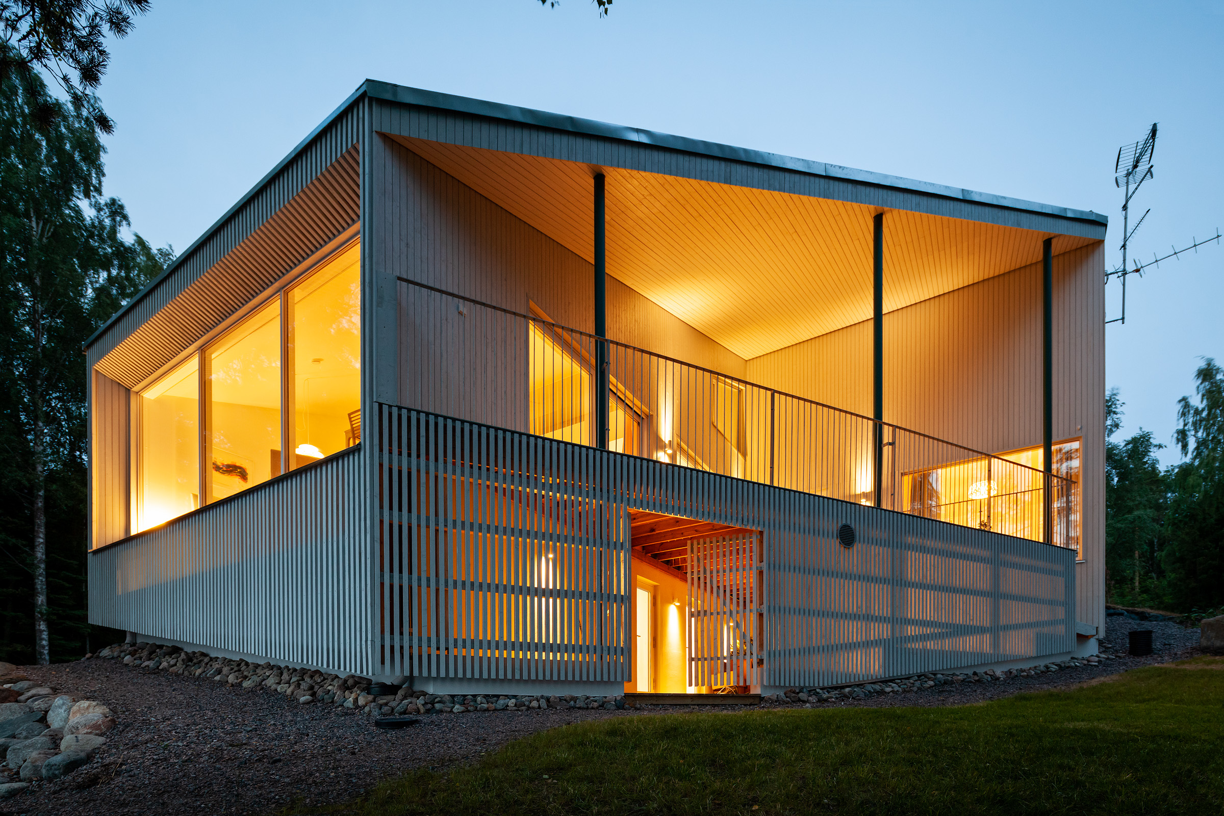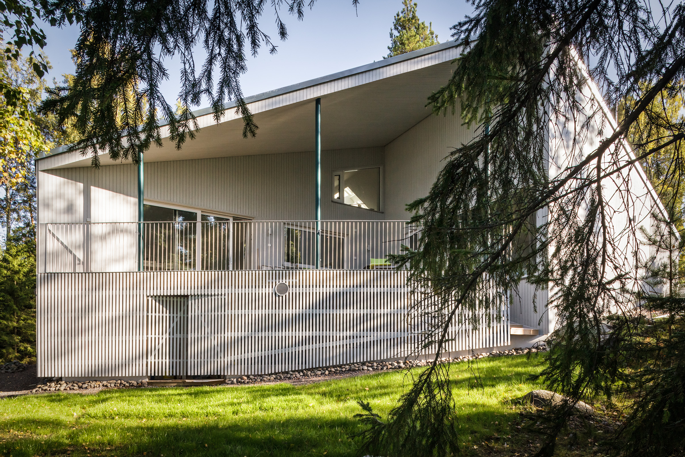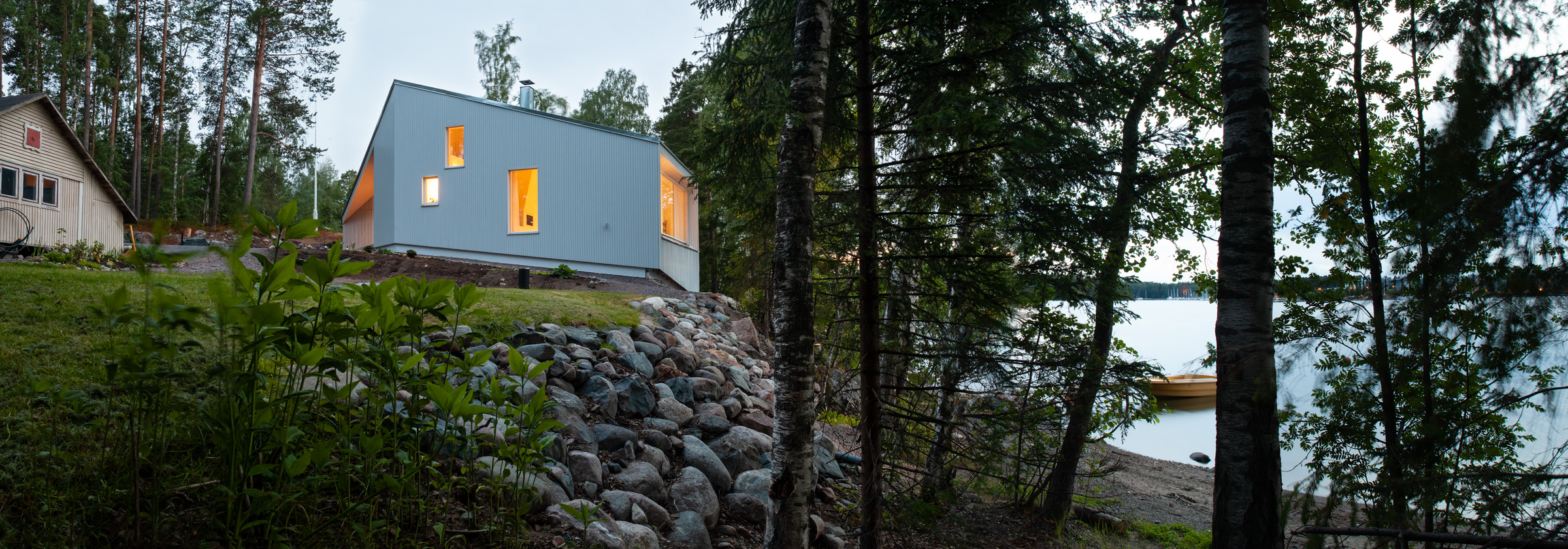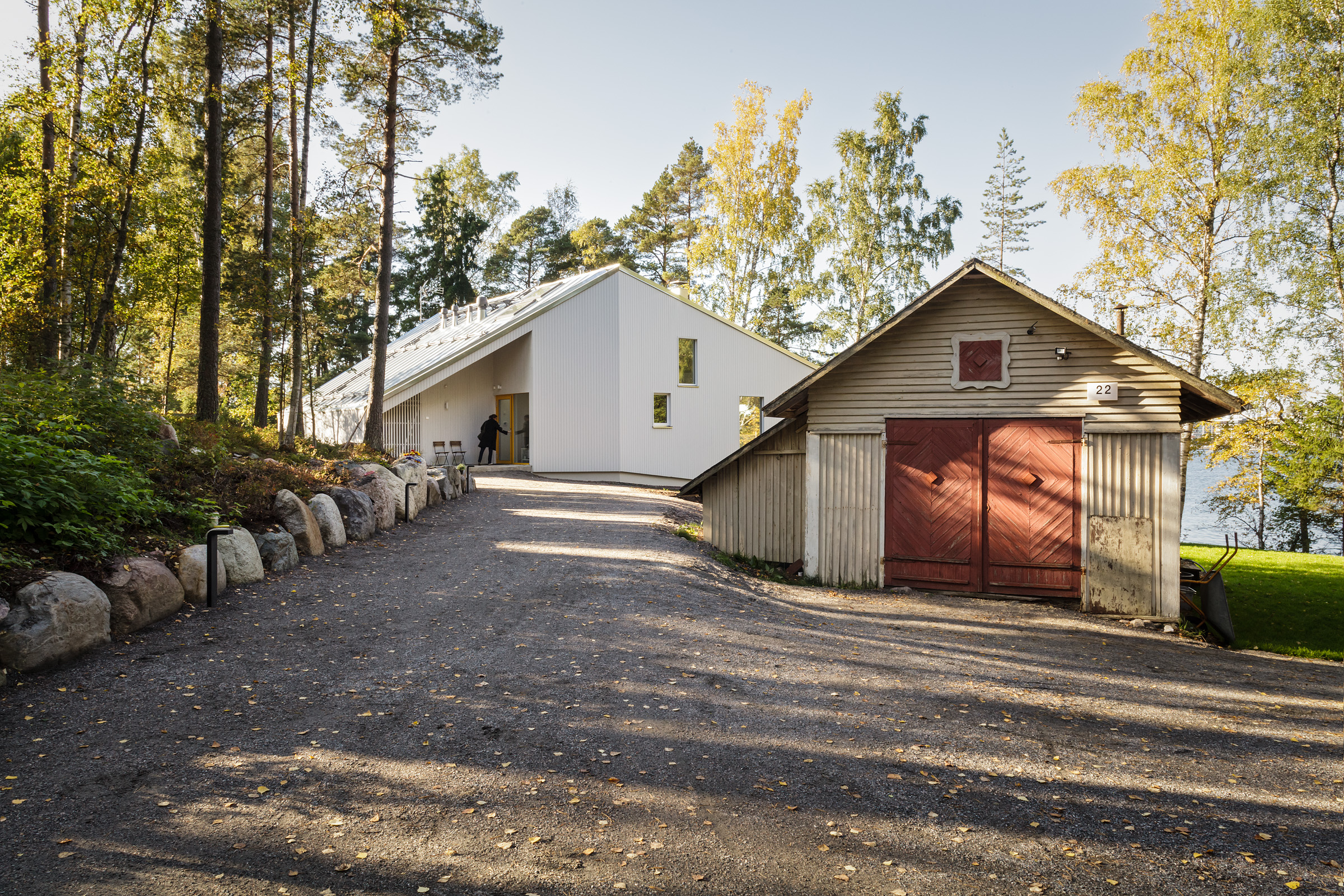 Uuden rakennuksen kattomuoto luo yksiaineisen ja modernin vaikutelman, mutta muodostaa silti yhtenäisen pihapiirin olemassa olevien rakennusten kanssa. Rinteeseen uppoavan ja ympäristöönsä todellista kokoaan pienemmäksi maastoutuvan ”kivenlohkareen” kulmiin on leikattu koloukset, joilla on saatu kutsuva sisäänkäynti ja suurempi oleskeluterassi länteen ilta-auringon suuntaan.