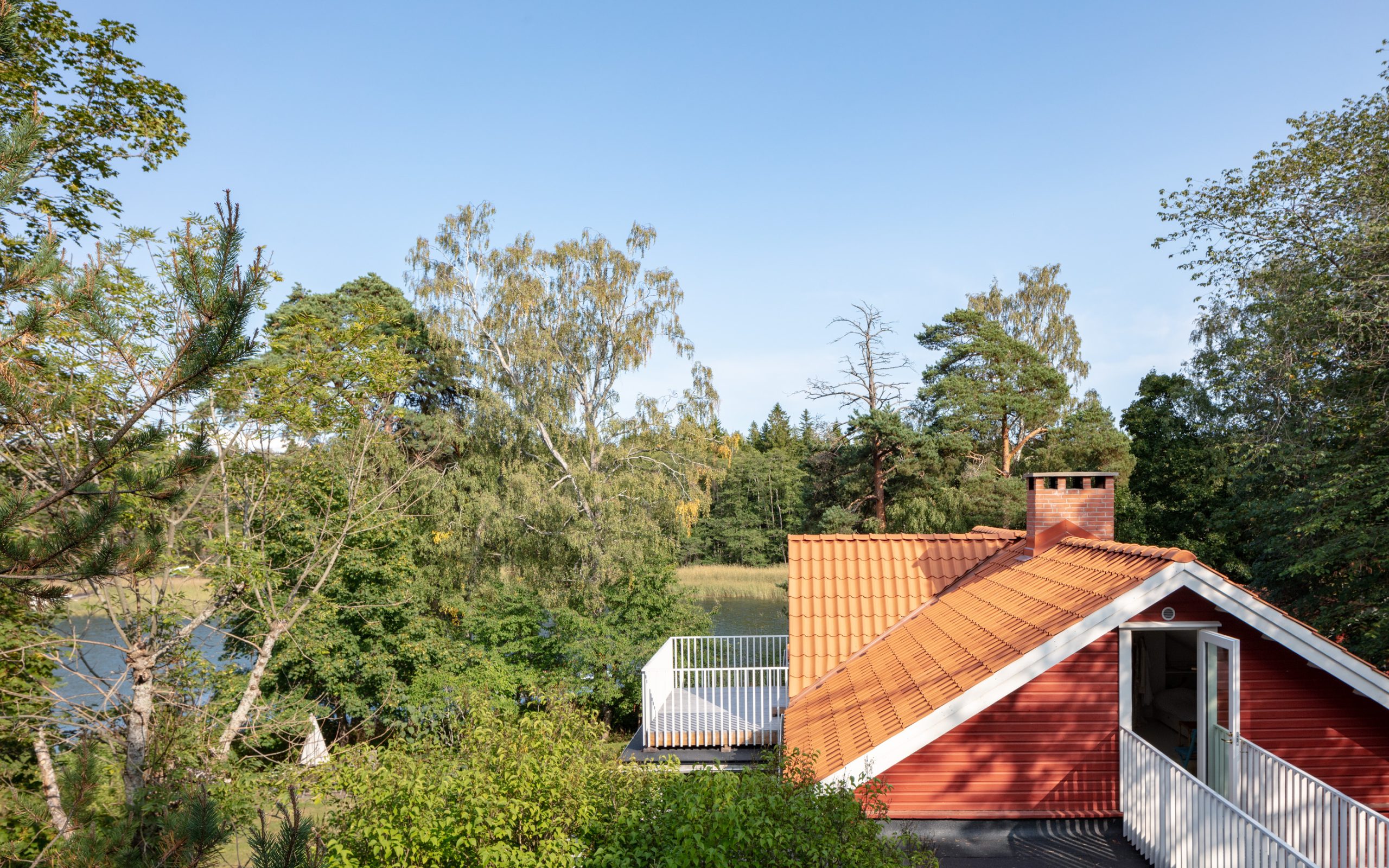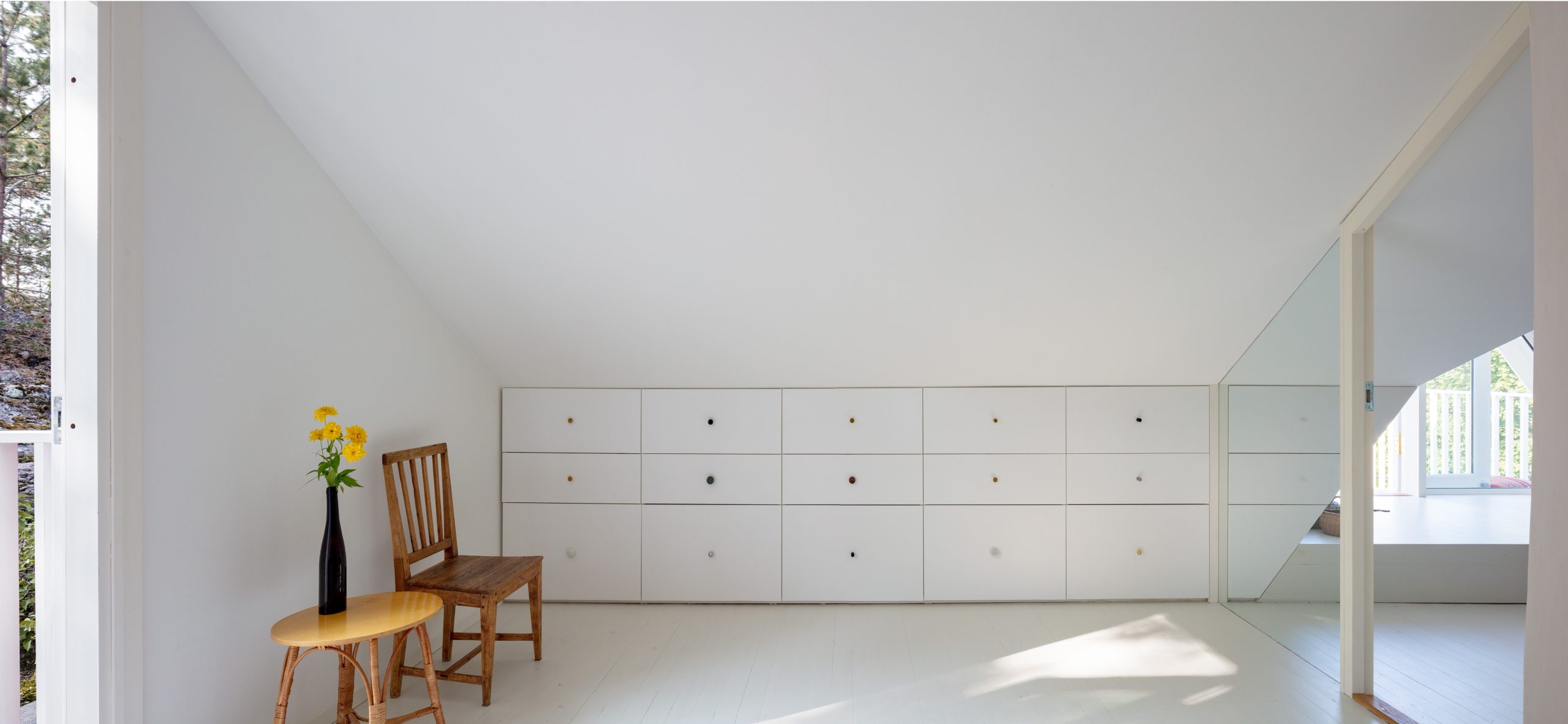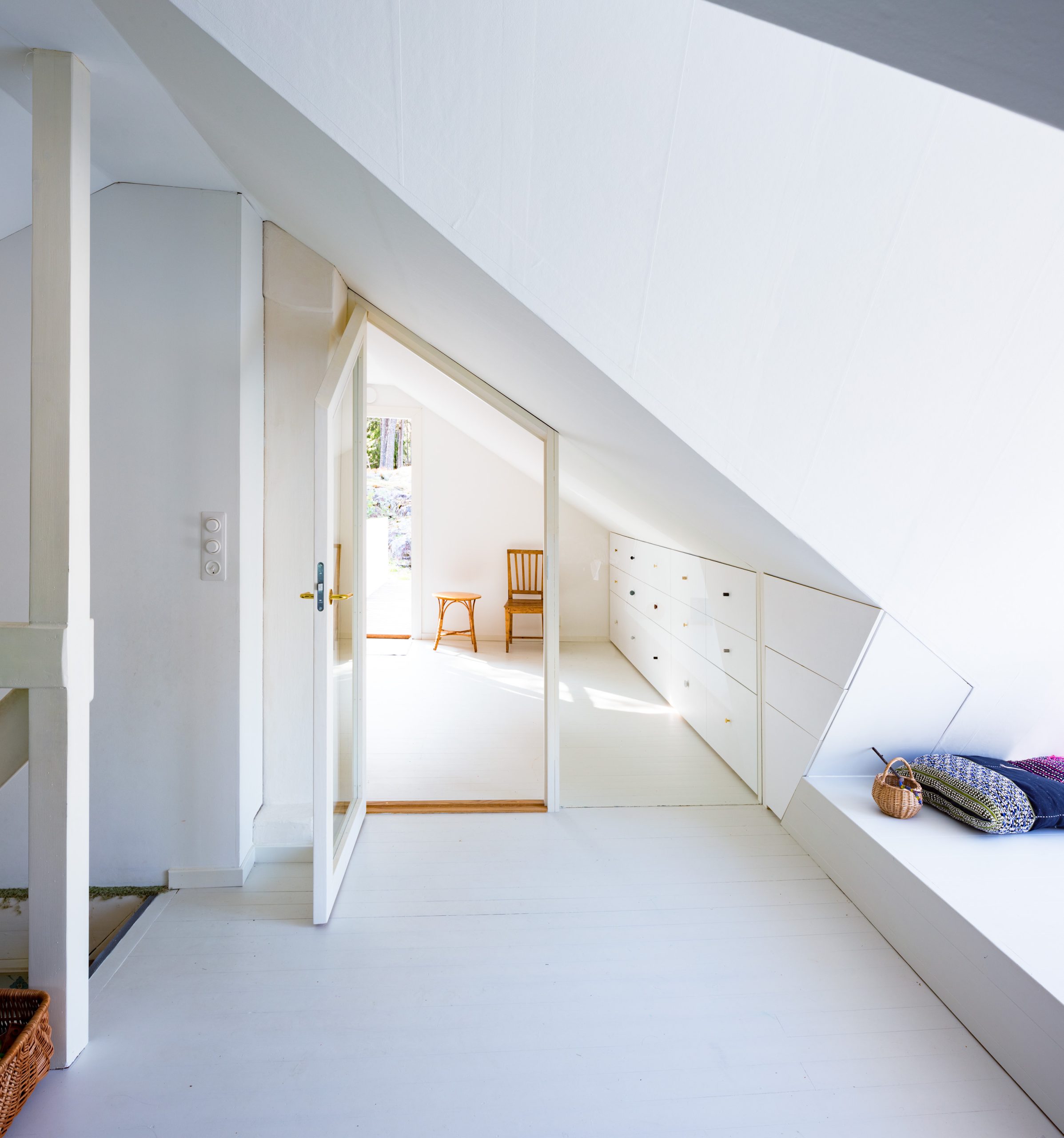 Vanhan 1800-luvun huvilan vinttikerros oli otettu 1930-luvulla käyttöön ja lisäeristetty 1980 ilman asianmukaisia tuuletusvälejä. Vesikaton rakenteet jouduttiin uusimaan ja vintti eristettiin pellavaeristeellä ja huokolevyllä, jonka pintaan laitettiin makulatuuripaperi. Vanhat lattiat maalattiin pellavaöljymaalilla. Vintille suunniteltiin mittatilaustyönä teetetyt kimpilevykalusteet, jotta matalimmatkin tilat saataisiin hyötykäyttöön. Vintiltä pääsee lasiverannan päälle rakennetulle parvekkeelle ja siltaa pitkin kalliolle.
