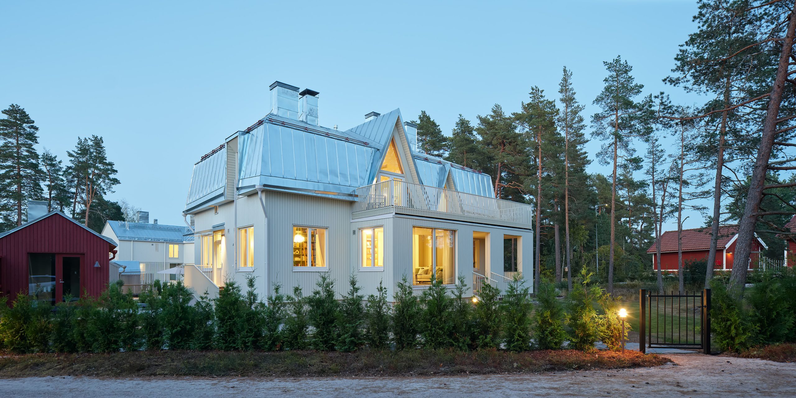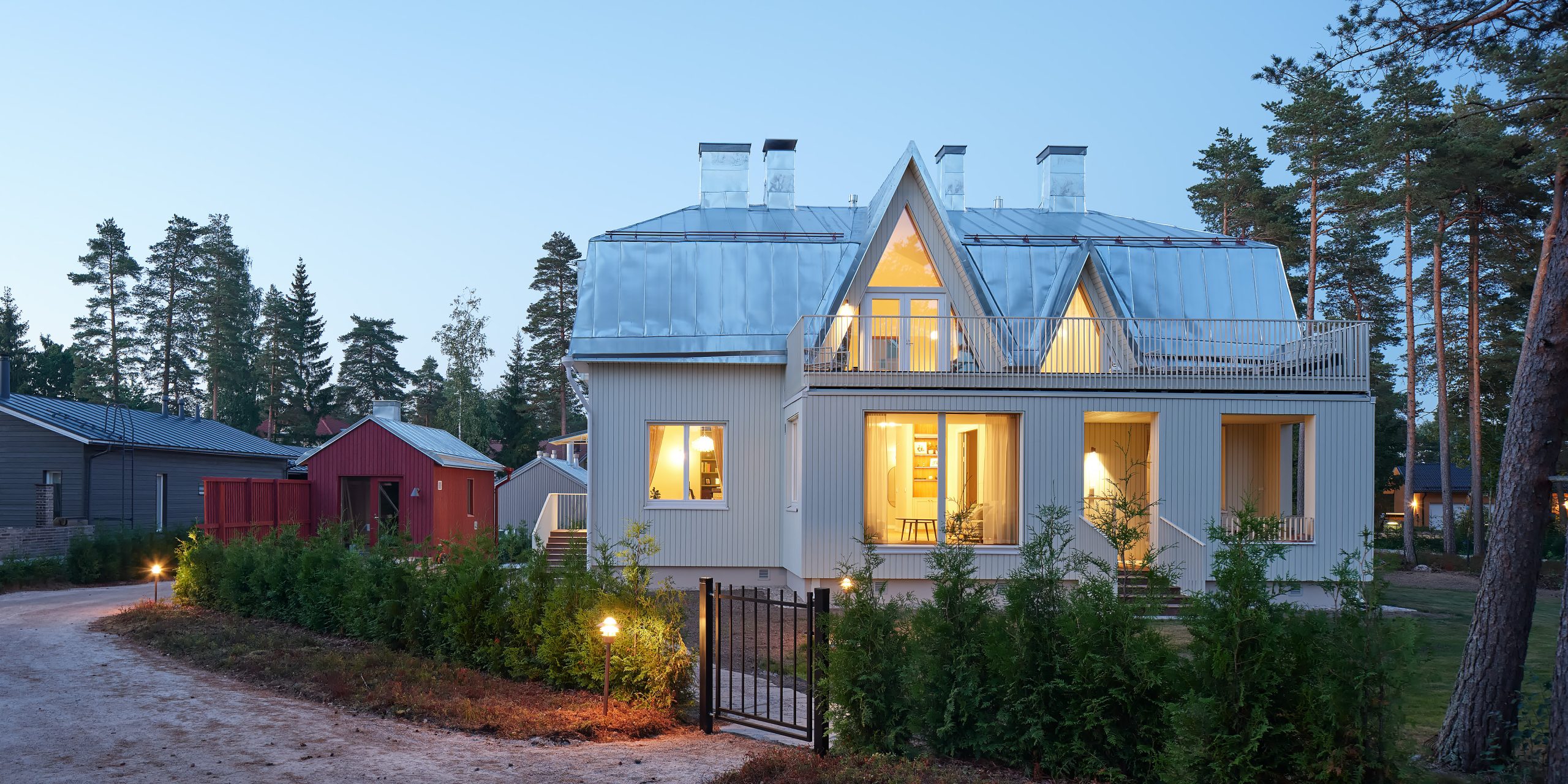 Päärakennuksen viereinen saunarakennus on puujulkisivultaan punainen viitaten alueella sijaitseviin muihin pieniin piharakennuksiin.