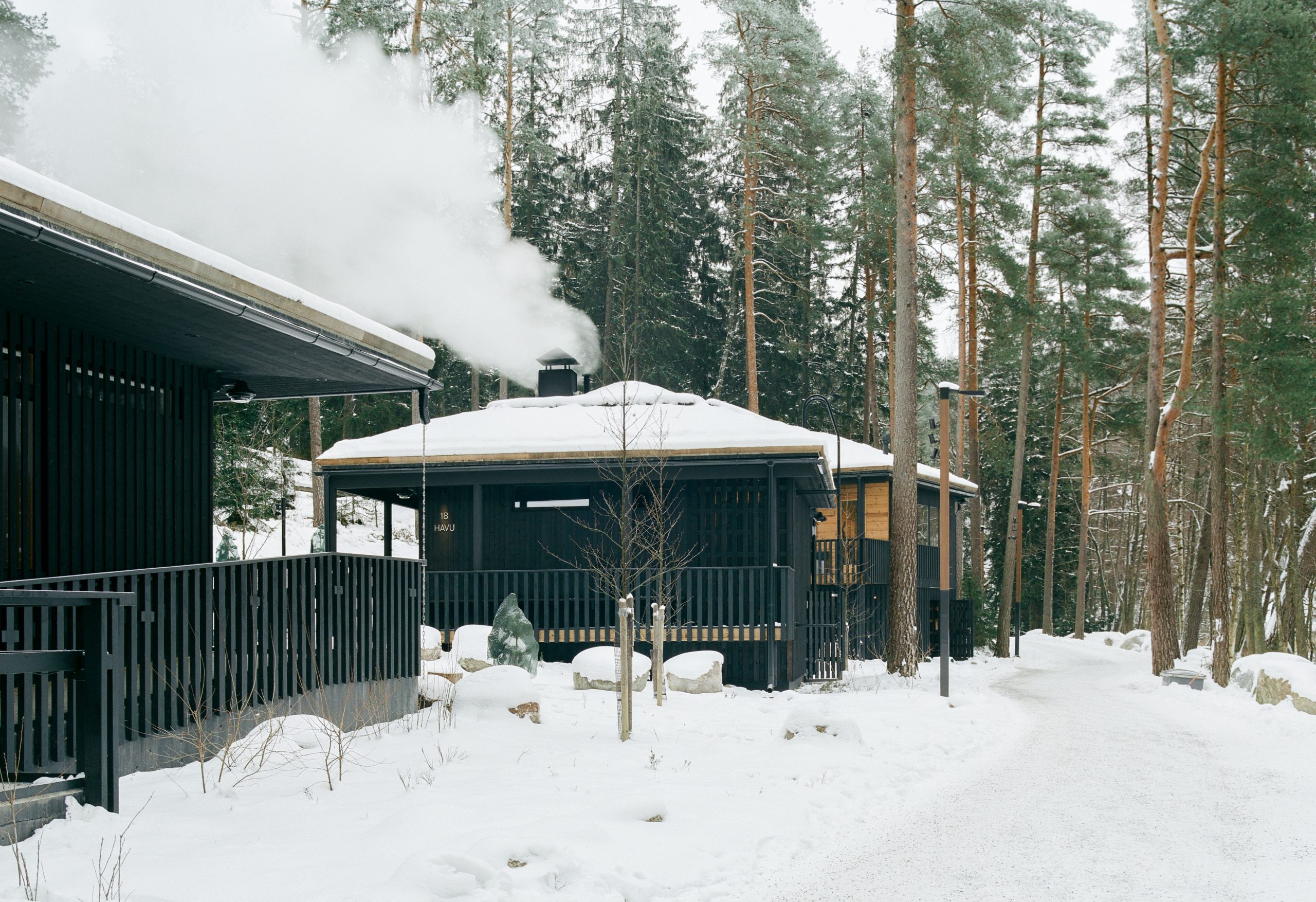 Kaksi savusaunaa, puku- ja pesuhuonerakennus sekä infokatosrakennus ainutlaatuiseen ulkoiluympäristöön ja suosittuun saunomispaikkaan Vantaan Kuusijärvelle.